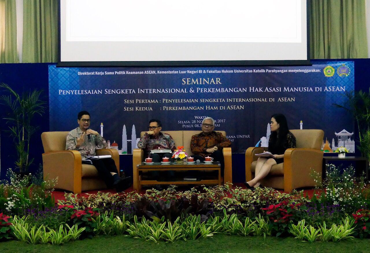 Fakultas Hukum Universitas Katolik Parahyangan (FH UNPAR) bekerja sama dengan Direktorat Kerja Sama Politik Keamanan ASEAN, Kementerian Luar Negeri Republik Indonesia (Kemlu RI) mengadakan seminar bertajuk “Penyelesaian Sengketa Internasional dan Perkembangan Hak Asasi Manusia di ASEAN” pada Selasa, 28 November 2017. Seminar yang diadakan di Aula Pascasarjana UNPAR ini bertujuan menjembatani pemahaman praktis dan akademik mengenai aktivitas dan perkembangan ASEAN dalam hal penyelesaian sengketanya serta perlindungan HAM dalam lingkup regionalnya.