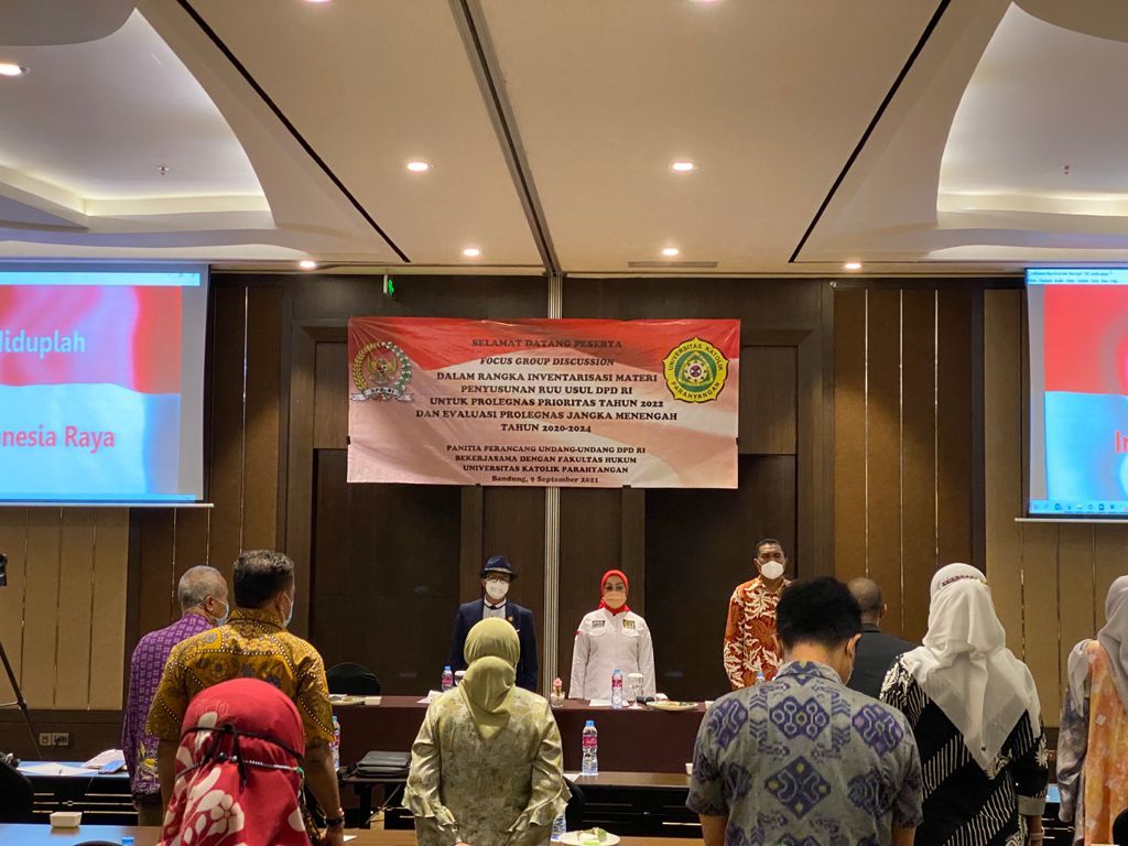 Bandung, 9 September 2021 Fakultas Hukum Universitas Katolik Parahyangan bersama Panitia Perancang Undang-Undang Dewan Pemerintah Daerah Republik Indonesia (PPUU DPD-RI) mengadakan kegiatan Forum Group Disscusion (FGD) untuk inventarisasi Materi Penyusunan Program Legislasi Nasional (Prolegnas) prioritas tahun 2022 dan evaluasi Prolegnas Jangka Menengah 2020-2024. Kegiatan ini diselenggarakan di Hotel Crowne Plaza Kota Bandung dengan tetap memperhatikan protokol kesehatan dalam masa Pandemi Covid-19. Kegiatan ini adalah bagian dari salah satu program kerja sama Fakultas Hukum UNPAR dengan Lembaga Negara dalam pembentukan hukum di tingkat nasional.