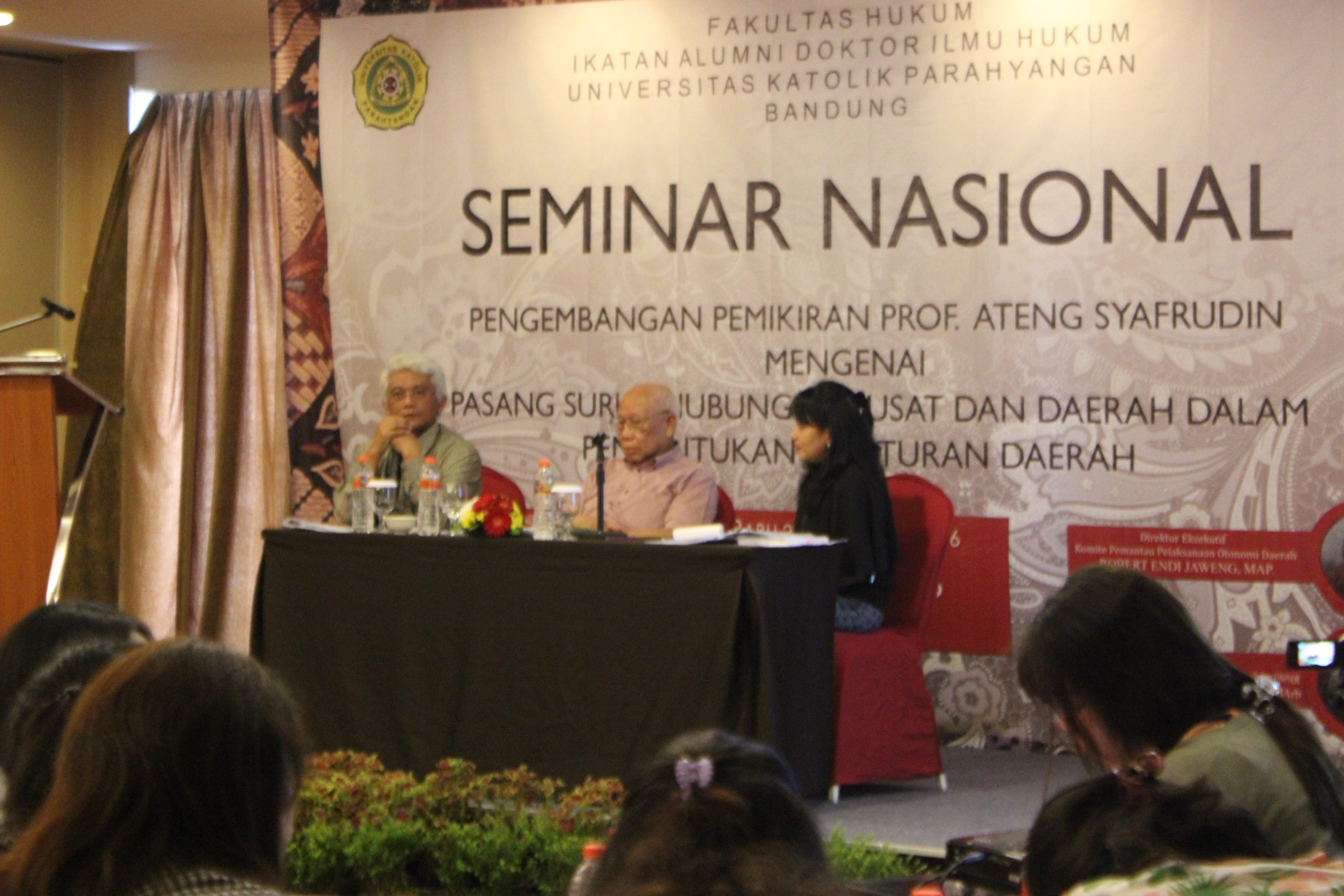 Dari hasil penelitian dan pengamatan, kerap terjadi masalah dalam pembentukan perda, sehingga terjadi pasang surut hubungan pusat dan daerah sebagaimana kerisauan yang dirasakan Prof. Ateng Syafrudin (Alm.). Oleh karena itu, perlu dikaji dan dibahas pemikiran Prof. Ateng dalam Hubungan Pusat dan Daerah masa kekinian khususnya dalam pembentukan Peraturan Daerah dalam suatu seminar yang menghadirkan berbagai Narasumber yang kompeten di bidangnya dan bertaraf nasional.